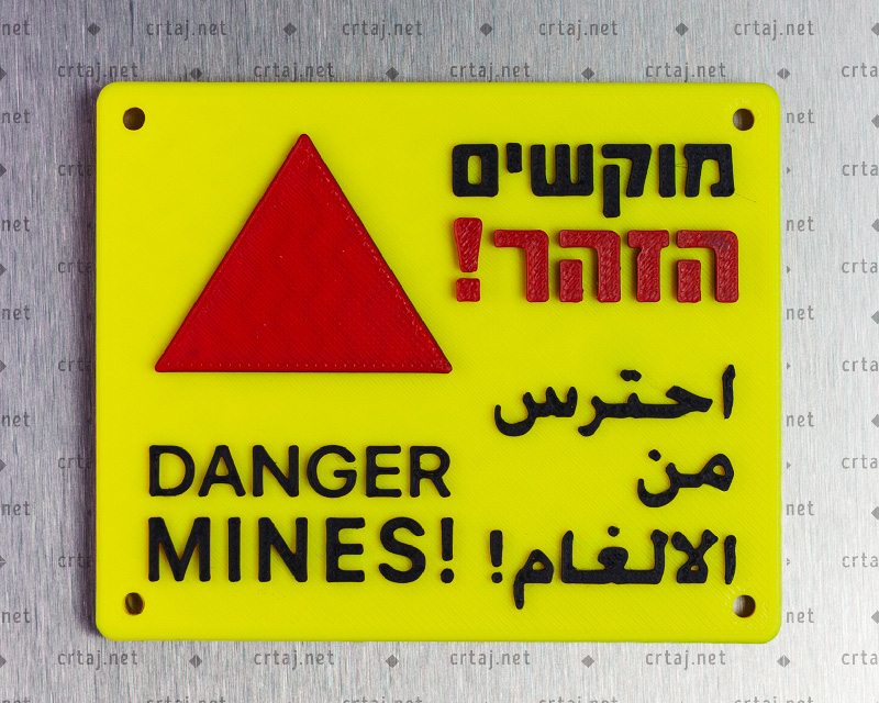 מגנט למקרר “סכנה, מוקשים!”, העתק מדויק של השלט הישראלי.